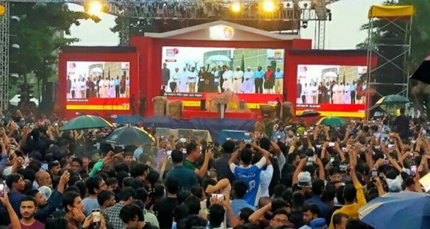 রাজধানীর মানিক মিয়া অ্যাভিনিউয়ে আয়োজিত অনুষ্ঠানে প্রধান উপদেষ্টা জুলাই ঘোষণাপত্র পাঠে বলেন, যেহেতু উপনিবেশ বিরোধী লড়াইয়ের সুদীর্ঘকালের ধারাবাহিকতায় এই ভূখণ্ডের মানুষ দীর্ঘ ২৩ বছর পাকিস্তানের স্বৈরশাসকদের বঞ্চনা ও শোষণের বিরুদ্ধে রুখে দাঁড়িয়েছিল এবং নির্বিচার গণহত্যার বিরুদ্ধে গণপ্রতিরোধ গড়ে ১৯৭১ সালের ২৬ মার্চ স্বাধীনতা ঘোষণা করে জাতীয় মুক্তির লক্ষ্যে রক্তক্ষয়ী মুক্তিযুদ্ধের মাধ্যমে বাংলাদেশ রাষ্ট্র প্রতিষ্ঠা করেছিল; এবং