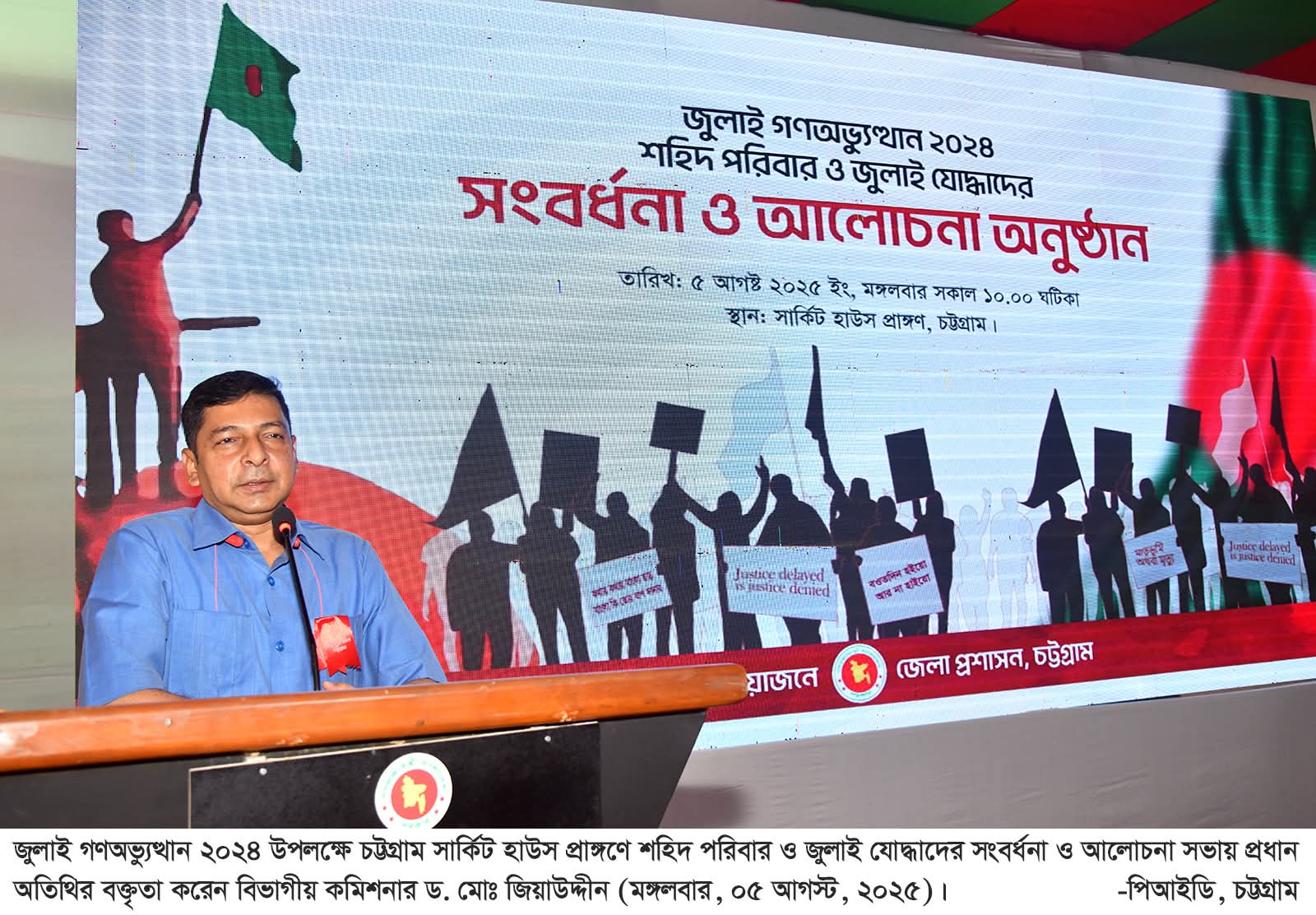 বিভাগীয় কমিশনার আজ চট্টগ্রাম সার্কিট হাউস প্রাঙ্গণে জেলা প্রশাসনের আয়োজনে জুলাই গণঅভ্যুত্থান ২০২৪ এ শহিদ পরিবার ও জুলাই যোদ্ধাদের সংবর্ধনা ও আলোচনা সভা অনুষ্ঠানে প্রধান অতিথির বক্তব্যে এসব কথা বলেন ।