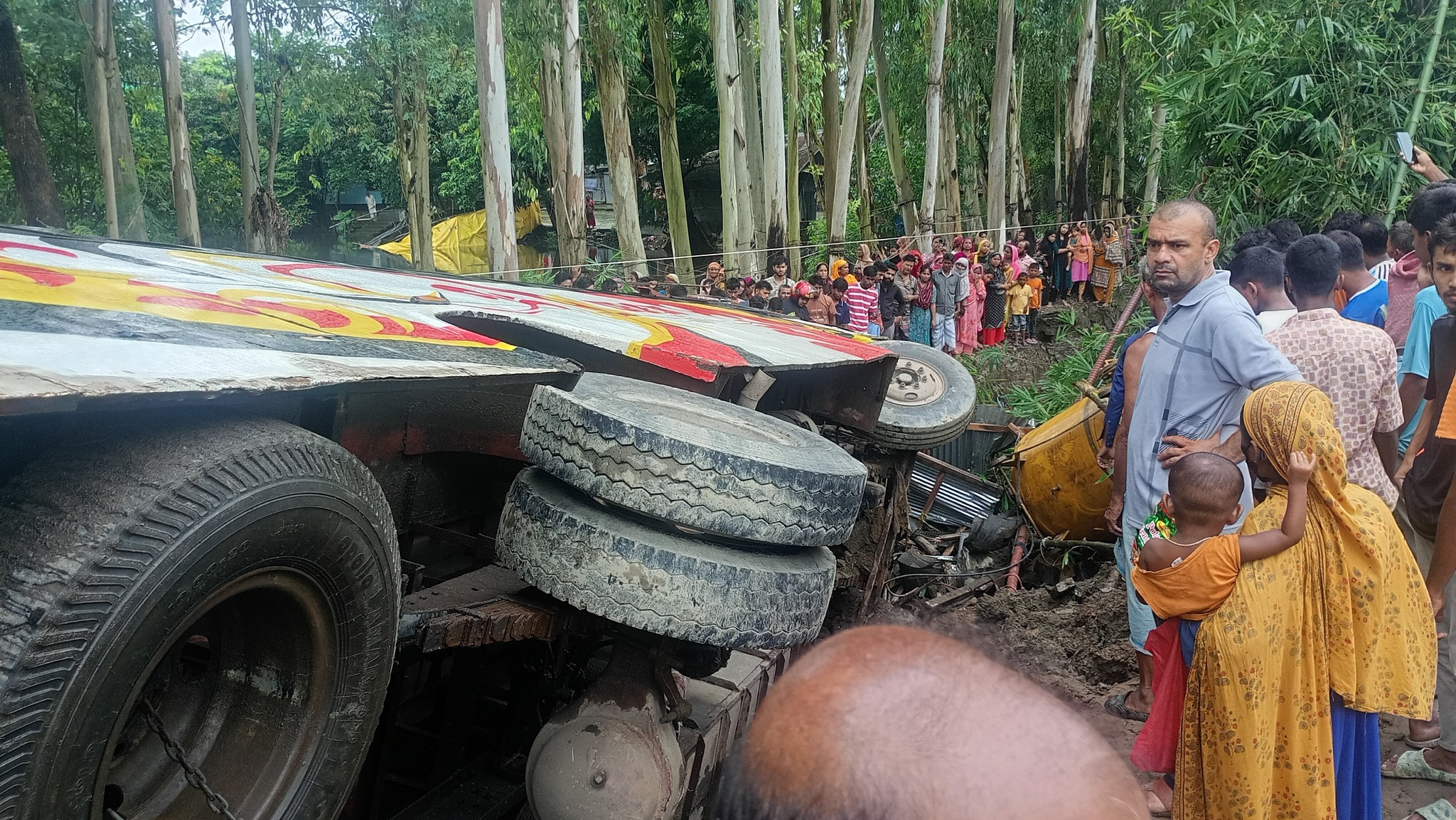 ফায়ার সার্ভিসের উদ্ধারকর্মীরা বলেন, বাস উল্টে গিয়ে রাস্তার পাশের এক দোকানিকে ধাক্কা দেয়। এতে তার শরীরের মাথা থেকে অর্ধেক অংশ কাদায় চাপা পড়ে। তবে তার পা ছিল বাইরে। ঘটনার পর হাইওয়ে পুলিশের রেকার দিয়ে বাস তুলে সে লোকটিকে উদ্ধার করার অল্প সময়ের মধ্যে তিনি মারা গেছেন।